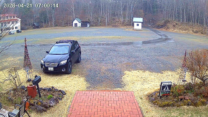 玄関前の定点撮影 後方はの広場はスキー場の第3駐車場